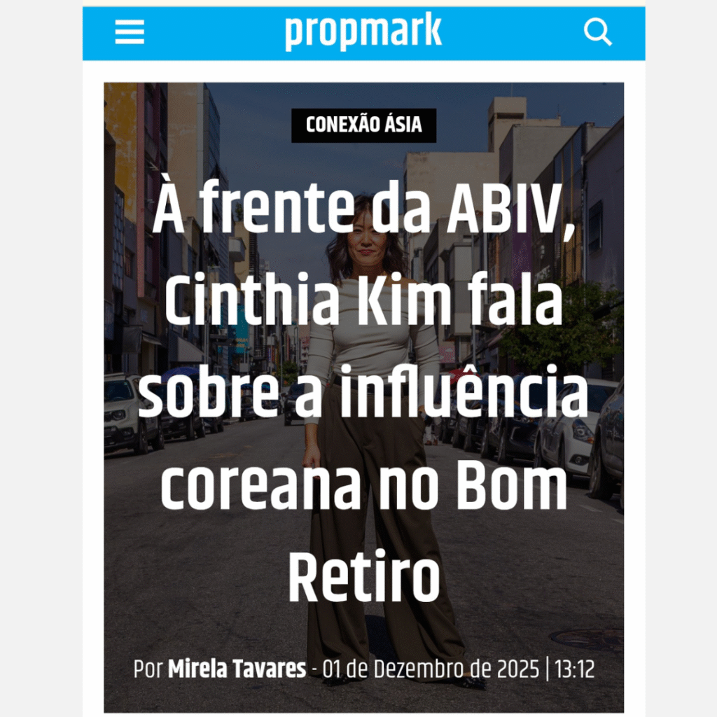 dezembro/25 À frente da ABIV, a presidente Cinthia Kim compartilhou com a revista Propmark @propmark sua visão sobre a influência coreana no Bom Retiro, em entrevista especial para a coluna Conexão Ásia. ✅ Confira a matéria completa no link: https://www.instagram.com/p/DR5NDdoEgjt/